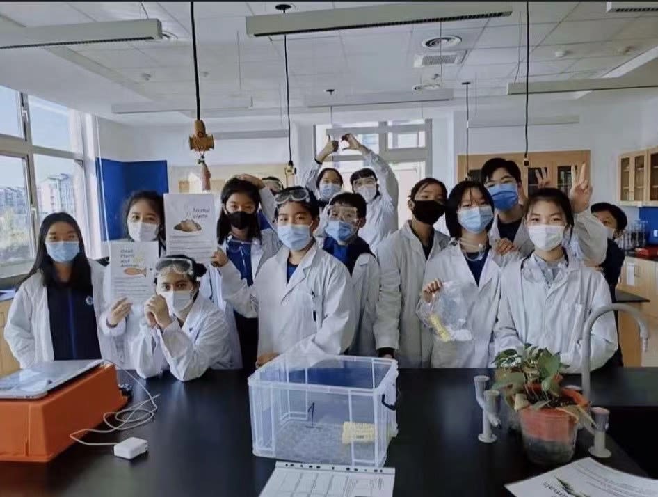 Mary Wang '26 and her 7th Grade Section in a Biology Lab. Photo courtesy of Mary Wang.