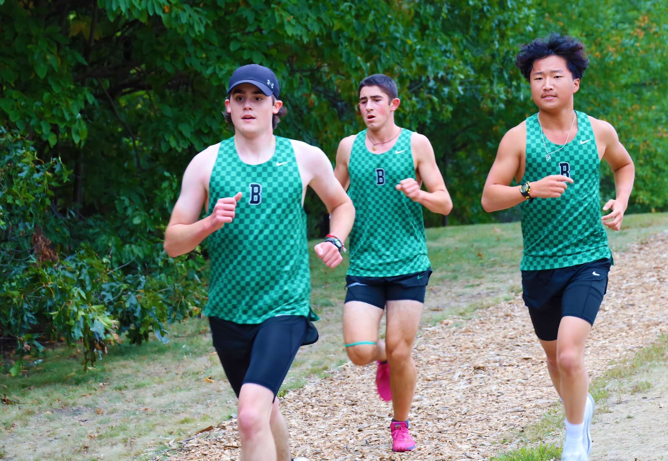 Brooks Neufeld '26 running with his teammates, Sam Gavin '25 and Huck Jennings '25.