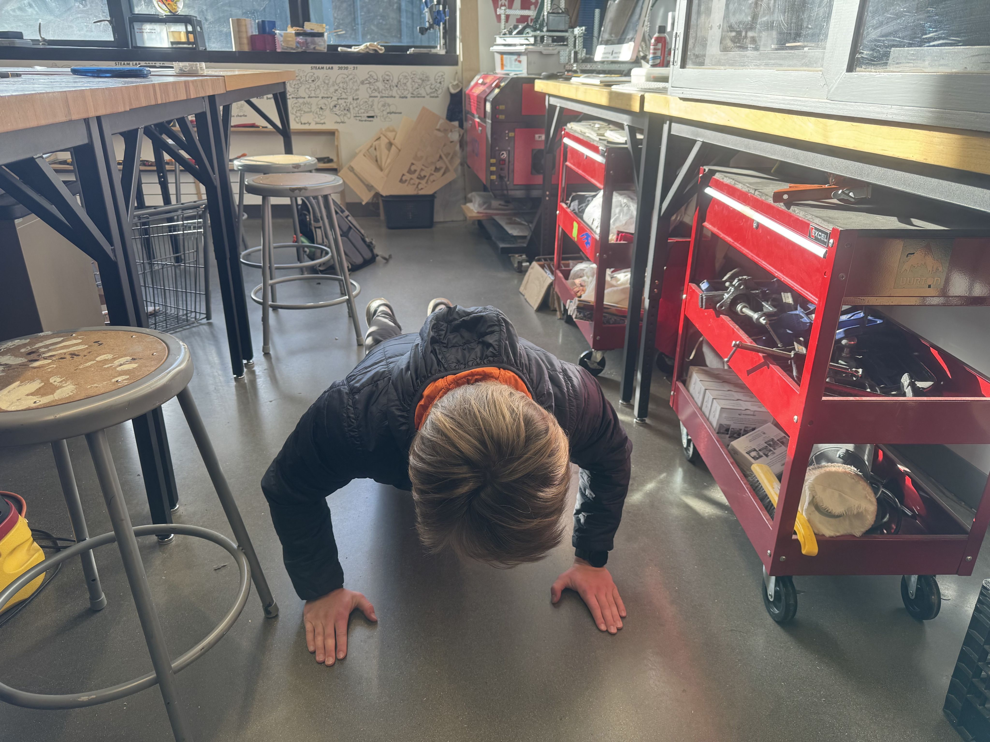 Andrew Flint '26 doing push-ups in the STEAM Lab. (Mary Wang)