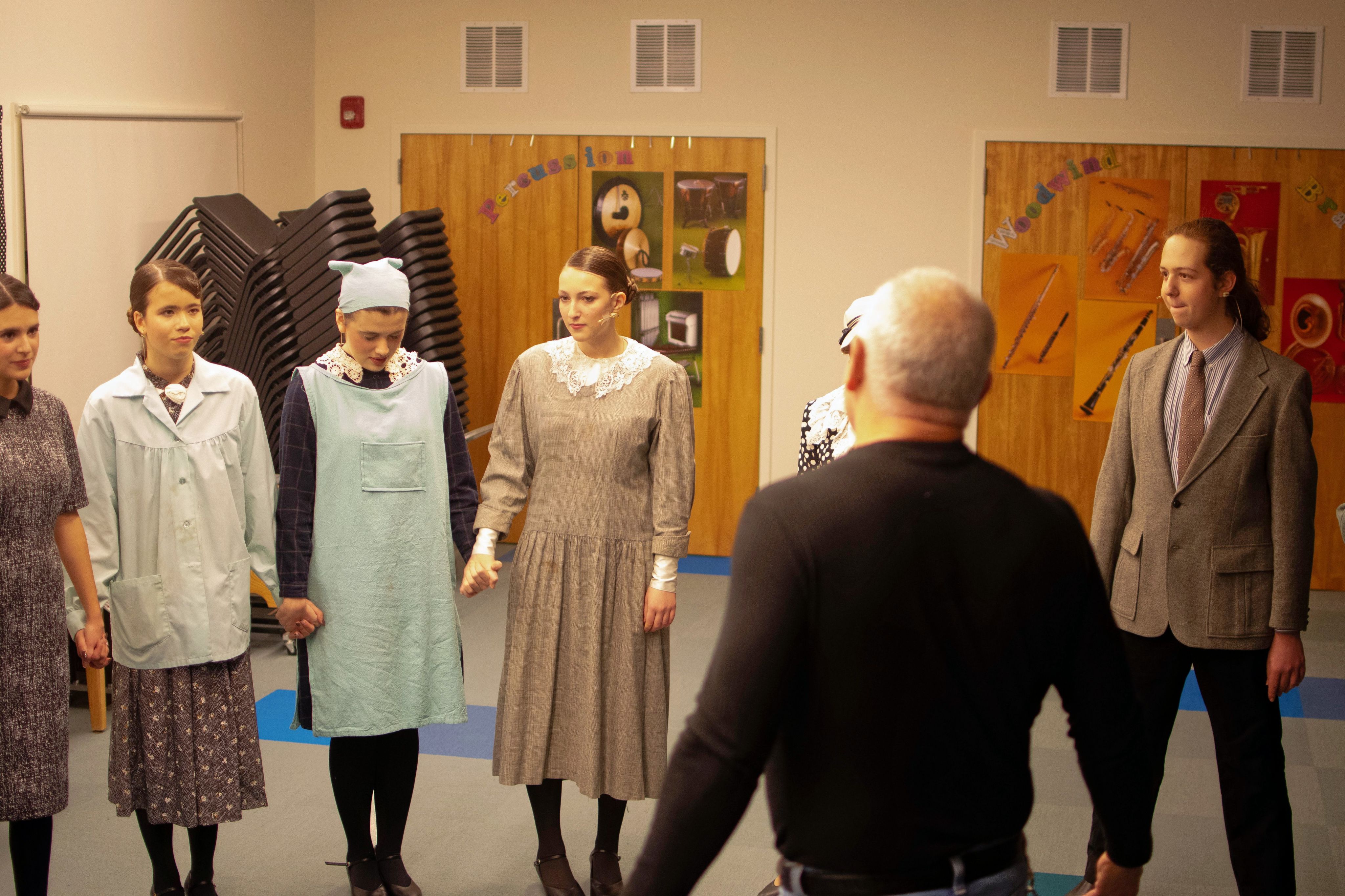 Director Bill Jacob leads the cast in a cheer before the curtain goes up.