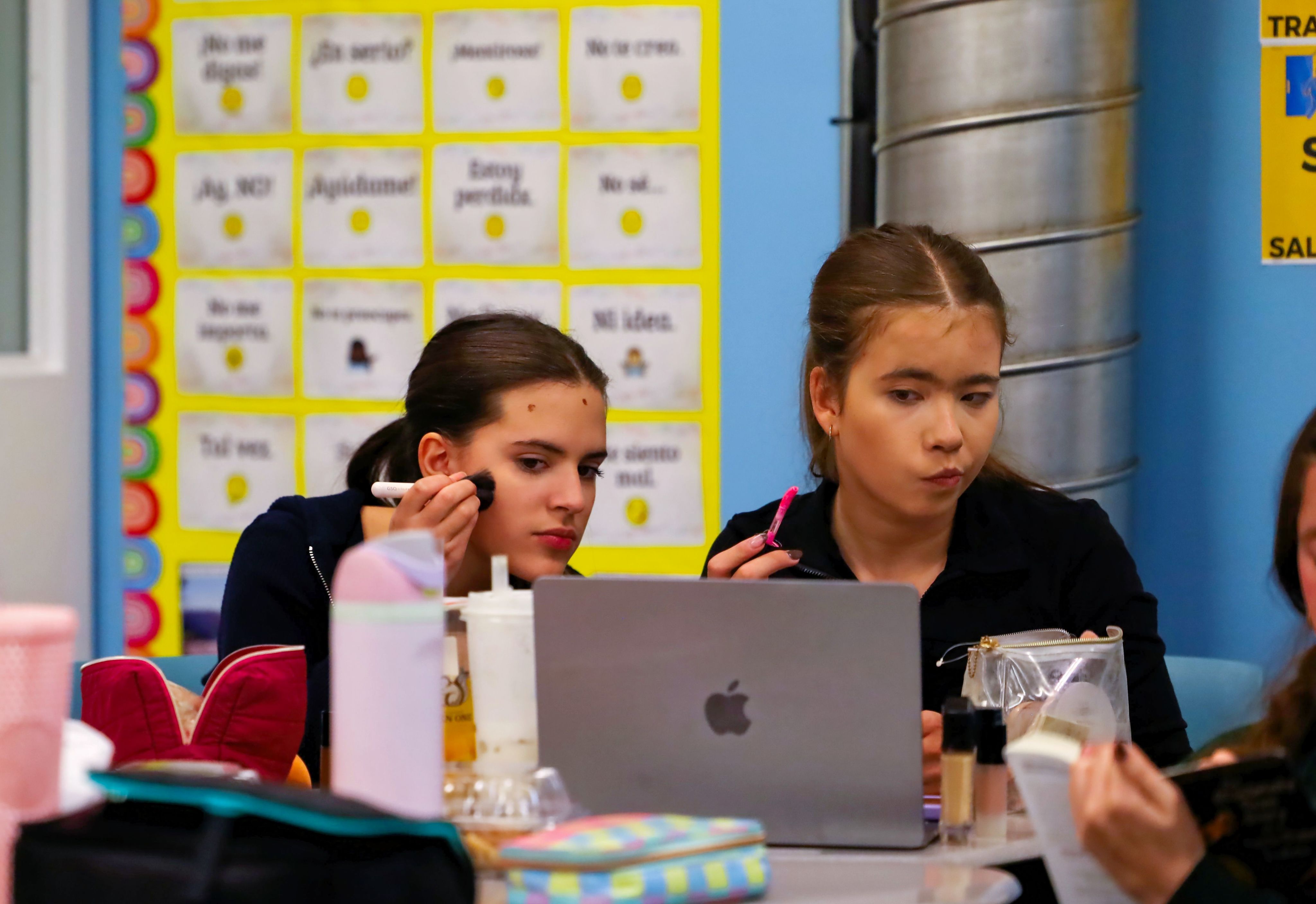 Bella Drummond '27 and Ali Shimomura '27 gets ready for the show.