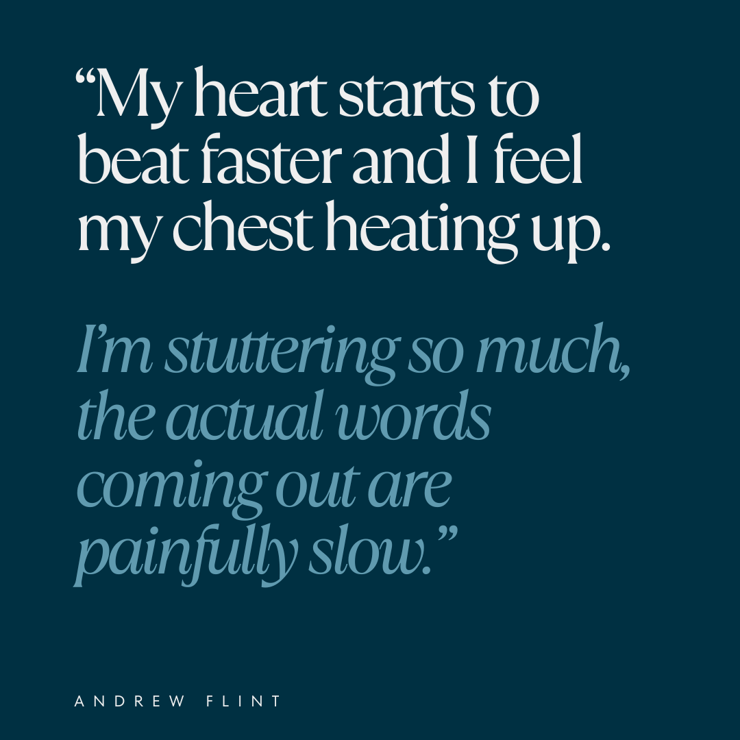 My heart starts to beat faster, and I feel my chest heating up. I say my question with great difficulty. I'm speaking very fast, but because I’m stuttering so much, the actual words are coming out painfully slowly.